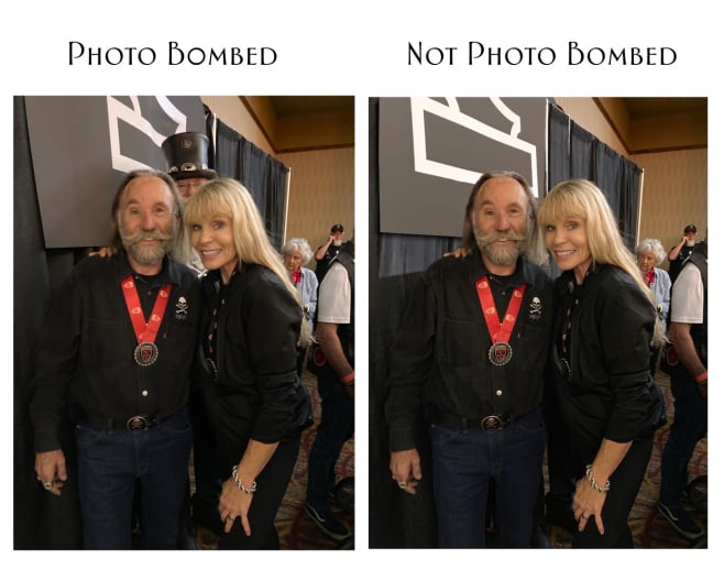 Photo bombed! This photo was a rare opportunity to get a picture with a friend and a member of the Harley-Davidson family. Unfortunately, a gentleman with a top hat wanted in too.